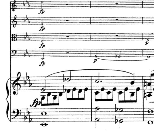 In turn all the other players contribute—rising sevenths, falling seconds, inversions of each other. Imagine a restaurant where the chef offered a dish entitled Seventh, Two Ways. The seventh rises passionately, if you will, to meet the world. The second reflects, darkens, thinks, falls away. (But again these two intervals are in a music theory sense the same, powerful mirrors of each other). Schumann rarely found such a perfect and tidy and effortless way to symbolize and distill his Florestan and Eusebius, his introvert and extrovert, his two facing selves, the one ready with wonder and passion to embrace humanity, the other shrinking away.